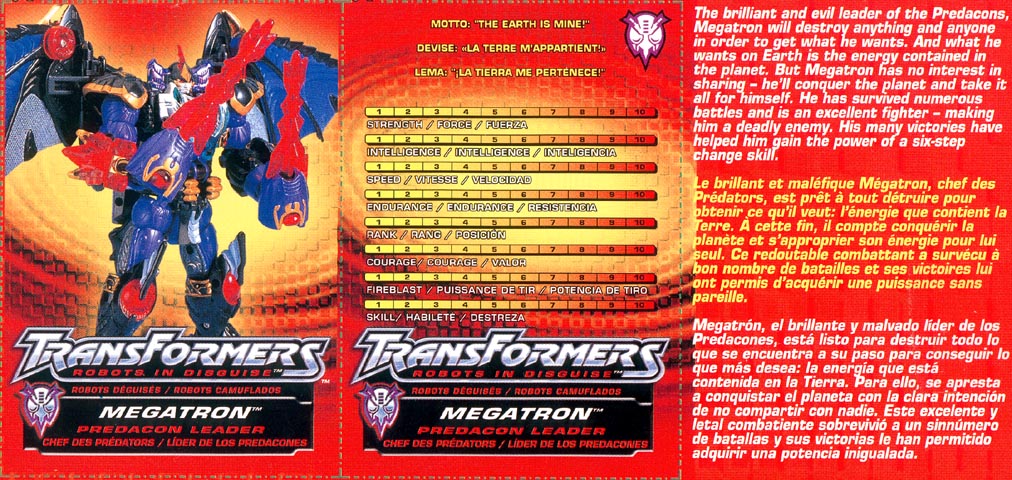 The brilliant and evil leader of the Predacons, Megatron will destroy anything and anyone in order to get what he wants. And what he wants on Earth is the energy contained in the planet. But Megatron has no interest in sharing - he'll conquer the planet and take it all for himself. He has survived numerous battles and is an excellent fighter - making him a deadly enemy. His many victories have helped him gain the power of a six-step change skill. |