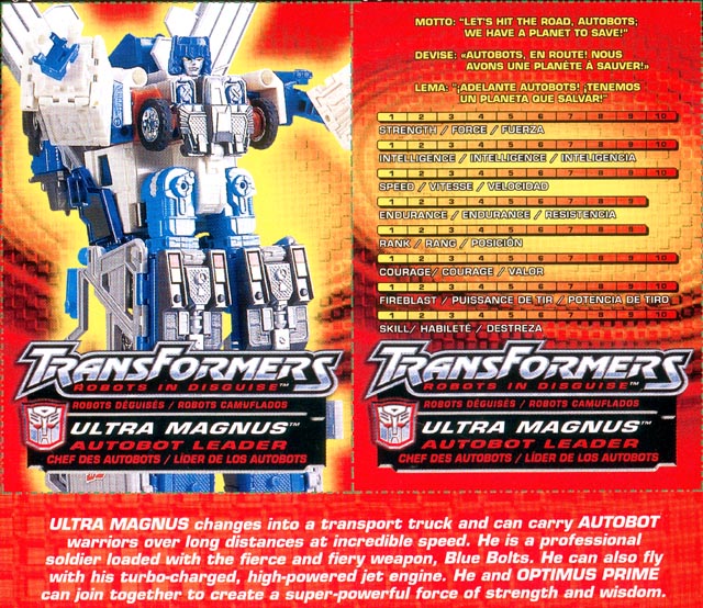 | Added by: Ale on September 27, 2002 Rated it: Comments: Hello, ultra magnus is marvellous, but this is more like a request, you 'll see, I have lost the instructions sheet to change ultra magnus, somebody would please send me one. I BEG OF YOU!!! |