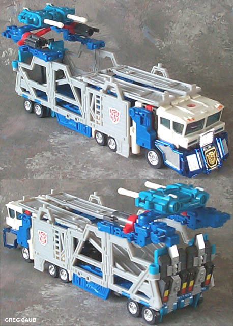 | Added by: Euge on October 14, 2001 Rated it: Comments: Can't say much about the robot mode, since I never figured out the transformation. The instructions can be quite confusing for young person. This by far is the most difficult robot to transform of all my figures. Great truck mode though, but falls apart easily like optimus when handled rough. I just bought this guy to form Omega Prime, and he is probably one of the most awesome looking figures I have ever seen! His feet can swivel side to side so no more standing the robot on the inside edge of foot when legs are apart. |