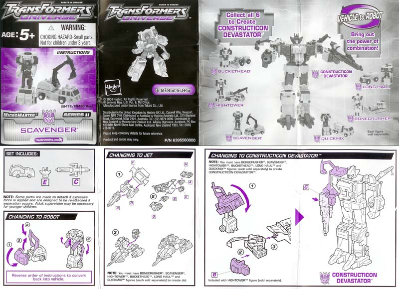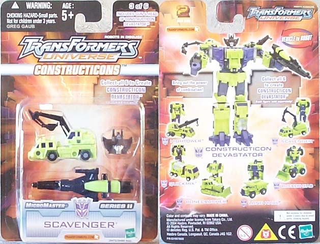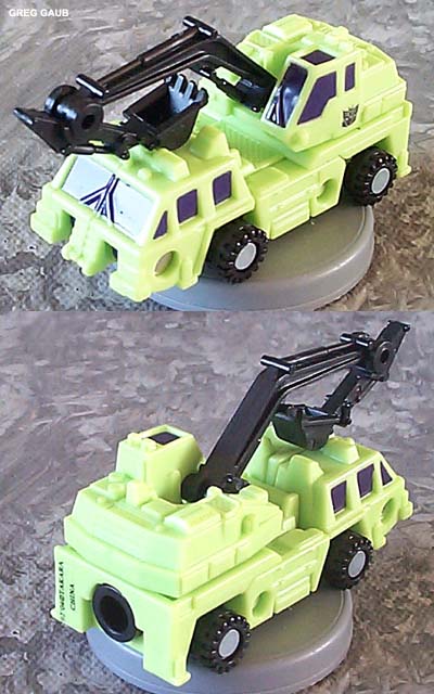 Greg's Review: Same review for all the Universe Devastator parts: These are Micromasters, plain and simple. The vehicle modes look pretty good. The transformations are really simple. The Robot modes are plain with limited articulation, and the green is a great neon Devastator green, as it should be. These toys are recolors of the Japanese Micromaster Sixbuilder and are well chosen and well done. |
